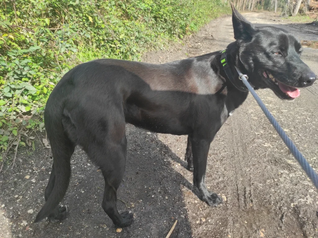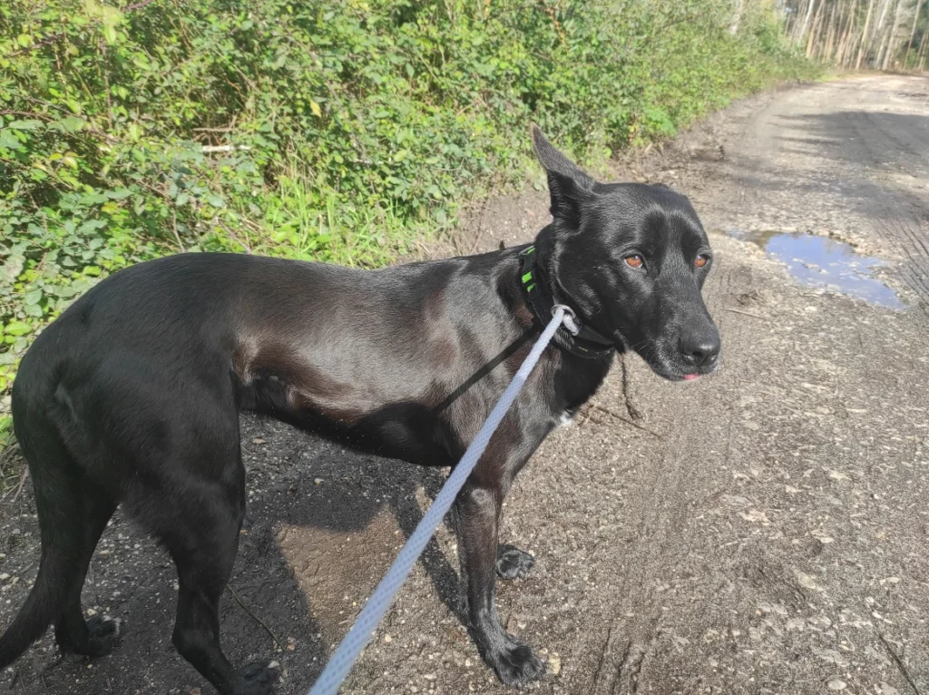 Blackie loopt prima aan de lijn, ze vindt het heerlijk om van de drukte van het asiel weg te zijn.