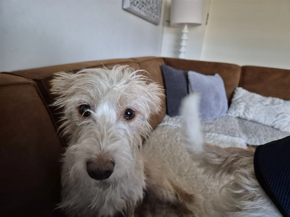 Joana, liefkozend “Muisje” genoemd, is een zachtaardig hondje met een gouden hart. In het begin is ze wat verlegen — onbekende mensen vindt ze spannend, en dan kruipt ze het liefst even weg in haar mandje of tegen haar vertrouwde mens aan. Geef haar echter een dag of twee, een beetje geduld en wat lekkers, en je ziet haar langzaam openbloeien.