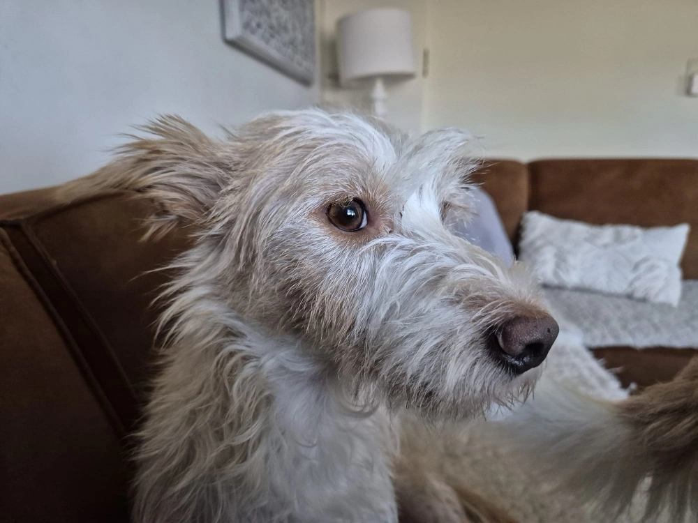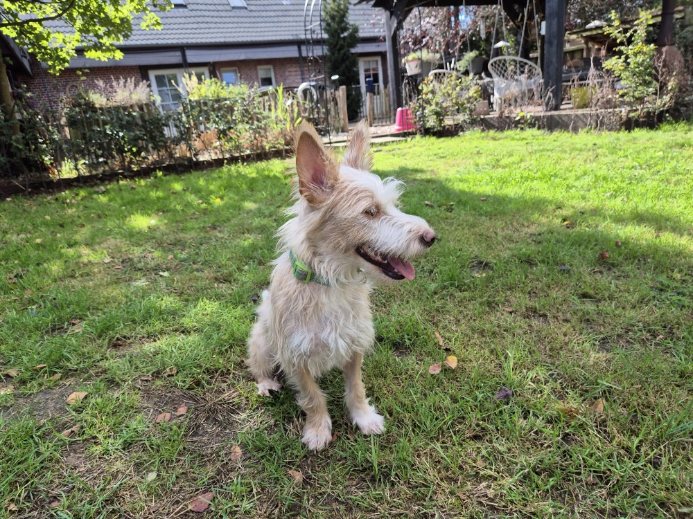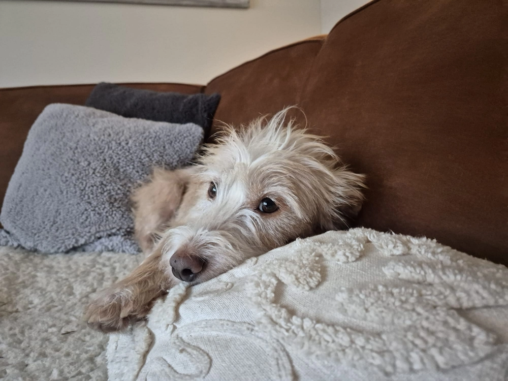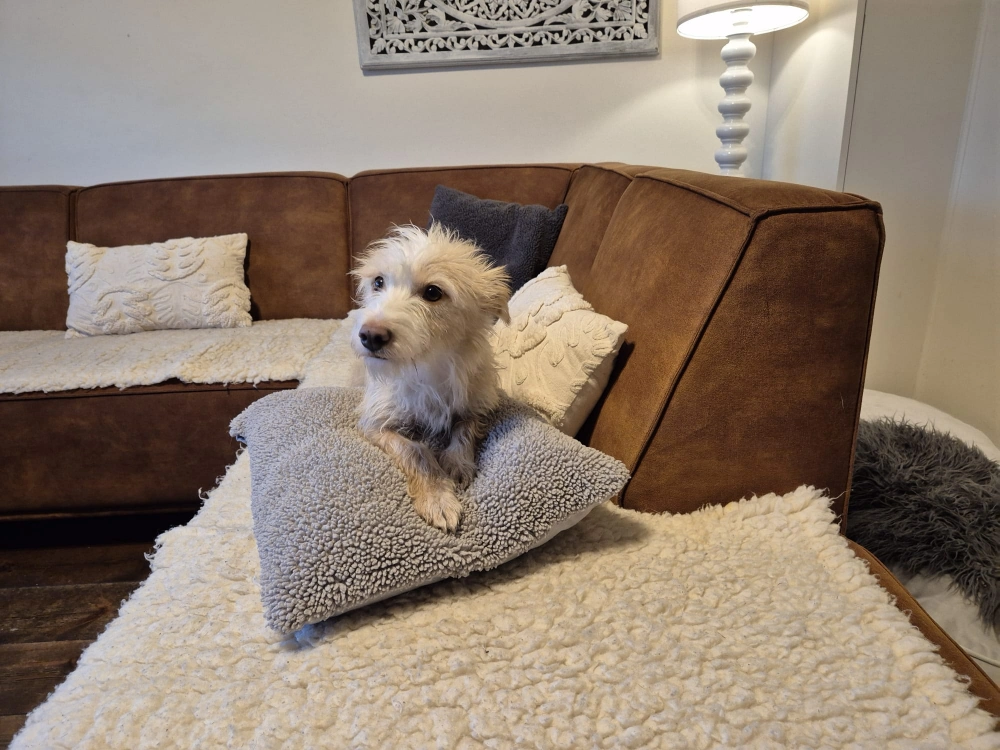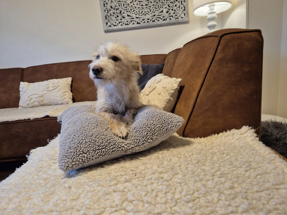 Joana, liefkozend “Muisje” genoemd, is een zachtaardig hondje met een gouden hart. In het begin is ze wat verlegen — onbekende mensen vindt ze spannend, en dan kruipt ze het liefst even weg in haar mandje of tegen haar vertrouwde mens aan. Geef haar echter een dag of twee, een beetje geduld en wat lekkers, en je ziet haar langzaam openbloeien.