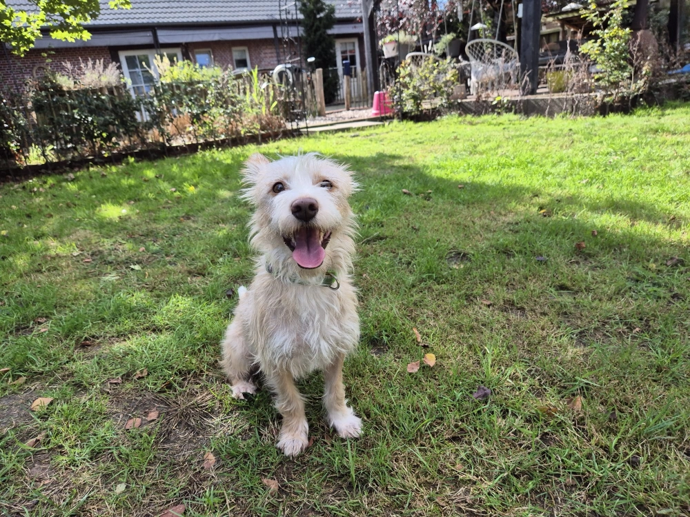 Toen ze eenmaal de liefde en veiligheid voelde, kwam haar echte karakter tevoorschijn: een blij, speels, ondeugend vriendinnetje dat dol is op knuffels, wandelingen en gezelligheid. Ze loopt keurig aan de riem, is volledig zindelijk en geniet van samen zijn.